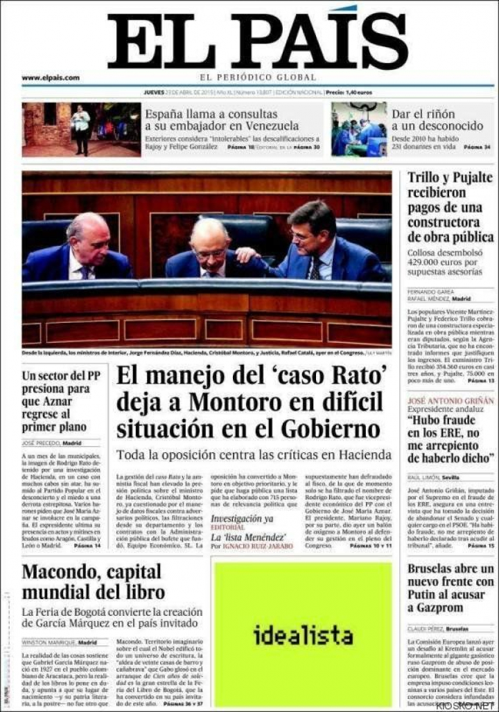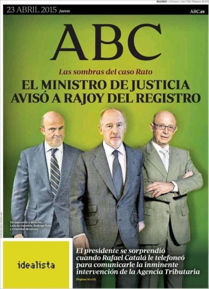 El titular de Hacienda "le contó hace un año a Rajoy el primer destello del caso". Así lo asegura El País y tira por tierra el argumento dado por el Presidente del Gobierno de que se enteró por la prensa. Es más, el detonante del caso Rato no fue su petición de regularización fiscal. "La espoleta que lo activó y descontroló todo, con ocultamiento de información y descoordinación entre diferentes ministerios", escribe Javier Casqueiro, "fue la filtración de que Rato estaba siendo investigado por Hacienda y los movimientos extraños en sus cuentas". Que Rajoy no se enteró por la prensa también lo asegura ABC, que en primera, con una foto de Rato escoltado por De Guindos y Montoro, asegura que fue "el ministro de Justicia quien avisó a Rajoy del registro". Y es al Presidente del Gobierno a quien cargos del PP piden que publique la lista de evasores, asegura El Periódico, en la que "Rato es el caso más llamativo de la amnistía", según sugiere el propio Montoro, como recoge Cinco Días. Así las cosas, se impone una investigación, reclama El País en un editorial que comienza de la siguiente manera: "Un país peligroso para los derechos de los ciudadanos es aquel en el que el ministro de Hacienda comenta selectivamente asuntos de contribuyentes, sus servicios elaboran una lista de 715 sospechosos y alguien guarda la mecha de esta bomba de relojería en vísperas de elecciones".