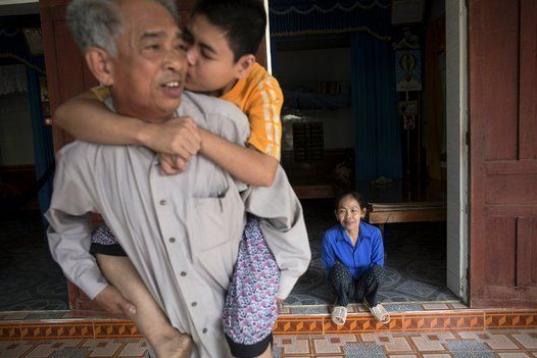 Do Duc Diu, un ex soldado, es besado por su hija discapacitada, Do Thi Nga, ante la mirada de su esposa. 12 de sus 15 hijos han muerto por enfermedades que los doctores vinculan con el agente naranja lanzado por EEUU. El antiguo soldado estuvo e...