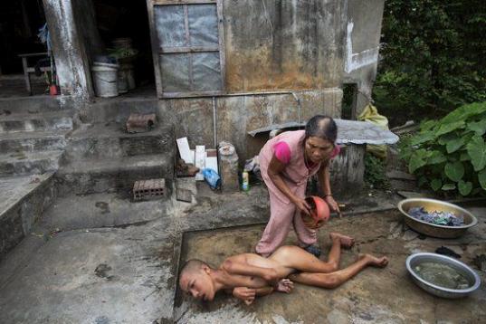 Tang Thi Thang baña a su hijo Doan Van Quy ante su vivienda en Truc Ly. El padre del menor fue militar, destinado en zonas donde se empleó el agente. Los dos hijos de la familia nacieron con discapacidades.
