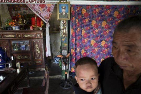 Doan Tue, con su nieta, ante una foto suya de cuando era militar. Están en su casa de Truc Ly. Doan Tue también fue soldado y tuvo hijos con discapacidad.