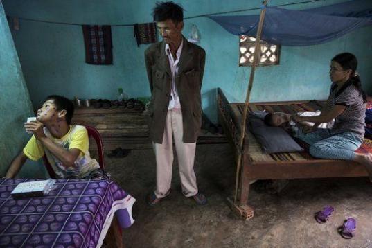Nguyen Hong Phuc, ex soldado de 63 años, sentado en la cama de su hijo Nguyen Dinh Loc, de 20, que se recupera de la operación de un tumor en las afueras de Hanoi. Nguyen Dinh Loc y sus descendientes tienen problemas porque el abuelo estuvo ex...
