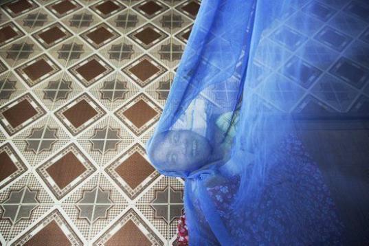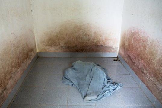 Doan Thi Hong Gam, de 38 años, que sifría un importante daño cerebral, se cubre a sí misma con una sábana en la habitación vacía en la que suele estar, en su casa de Thai Bin. Su padre la ha confinado allí por su comportamiento violento.