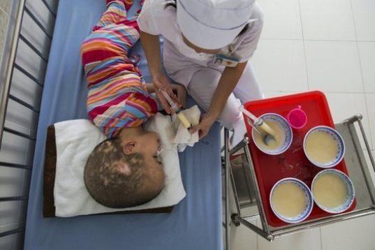 Pham Thi Phuong es alimentado en el hospital de Ho Chi Minh City. Su condición de salud es consecuencia de la exposición de sus padres al agente naranja.
