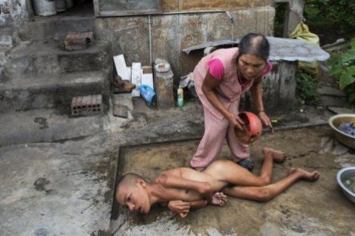 Le Dang Ngoc Hung, de 16 años, que sufre problemas físicos y mentales, descansa en su casa de Phuoc Thai. Su abuelo, militar, dice que fue expuesto reiteradamente al agente naranja e incluso fue rociado directamente por aviones militares de EEUU.