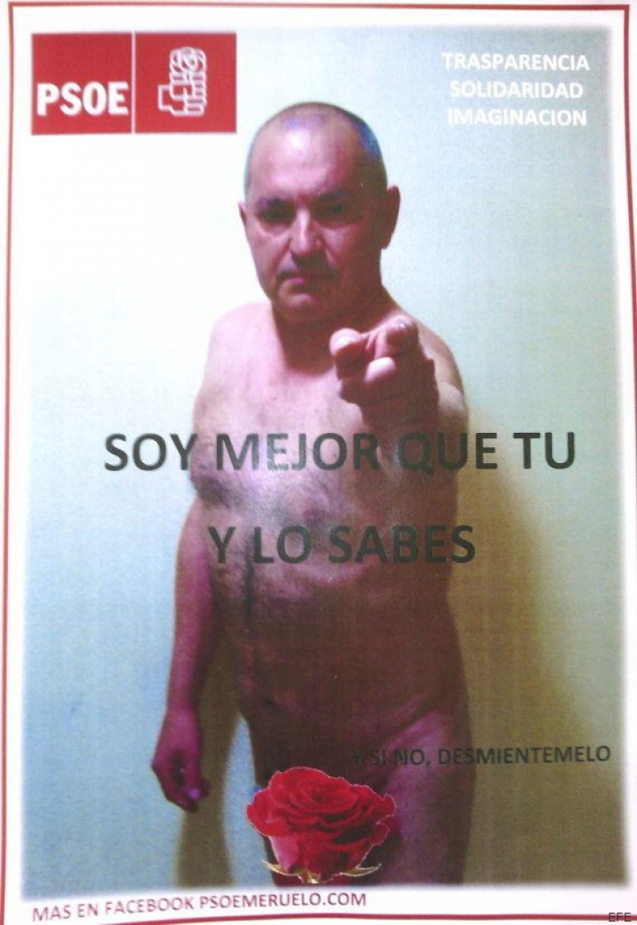 El candidato del PSOE a la Alcaldía de Meruelo (Cantabria), el independiente Luis Alberto Nicolás, ha pegado por el pueblo carteles en los que aparece desnudo, cubierto sólo en parte por una rosa, para tratar así de vencer el "miedo" al cambio en este municipio, gobernado desde 1979 por el PP.