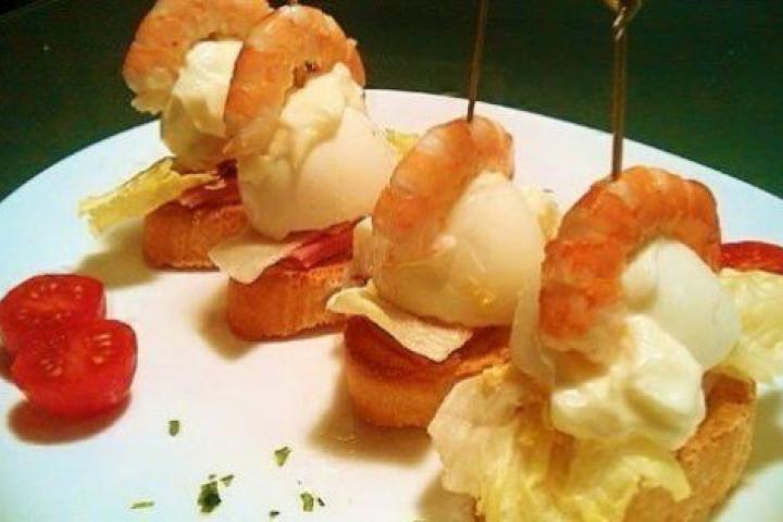 Se prepara con pan, huevo cocido, anchoas, langostinos y mahonesa.