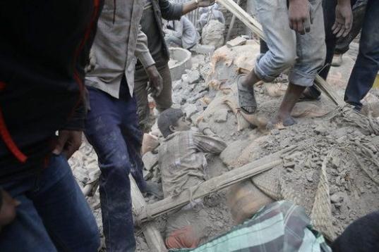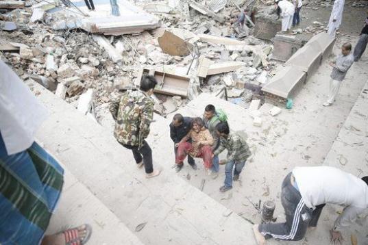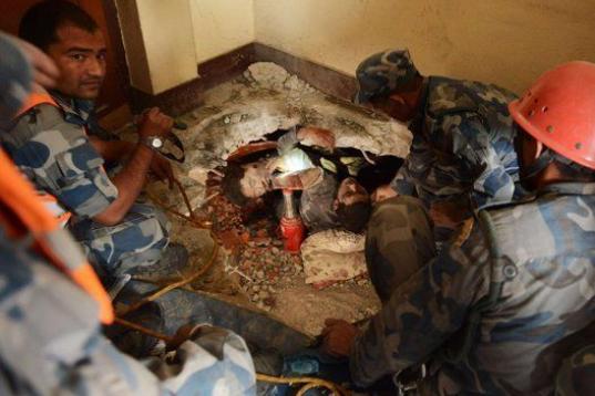 Servicios de rescate formales e improvisados, sacando heridos de Katmandú.