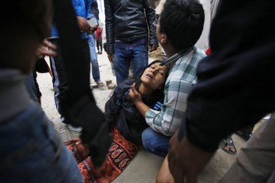 Una mujer, atendida en la capital de Nepal tras sobrevivir al derrumbe de su casa.