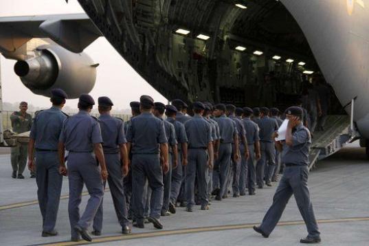Soldados de La India embarcan camino de Nepal para prestar ayuda.
