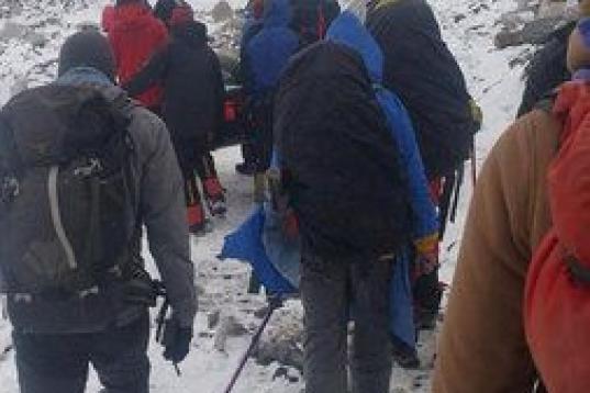 Un grupo de guías y montañeros trasladan a un escalador herido en el Everest por uno de los aludes. Hay al menos 18 montañeros muertos.