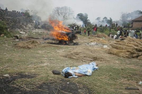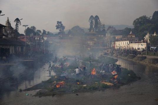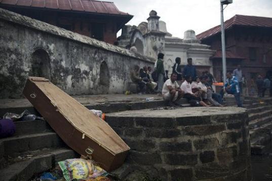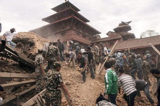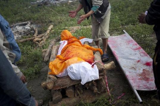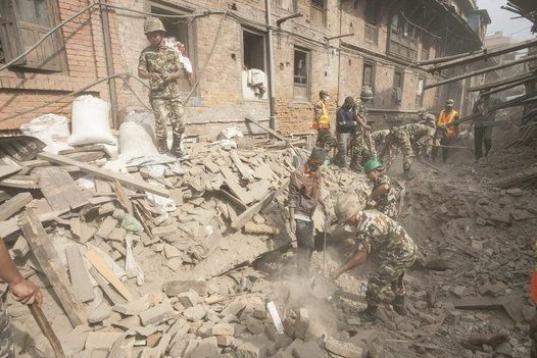 Los soldados nepalíes retiran uno de los cadáveres localizados en Katmandú, la capital.