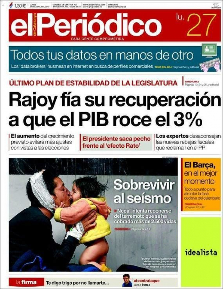 Un lugar donde aún hay esperanza, la que asoma en la foto de primera en El Periódico: un hombre sentado, con una venda que le cubre parte de la cabeza, mantiene en sus manos a su hija de ocho meses y la besa con ternura. Son supervivientes.
