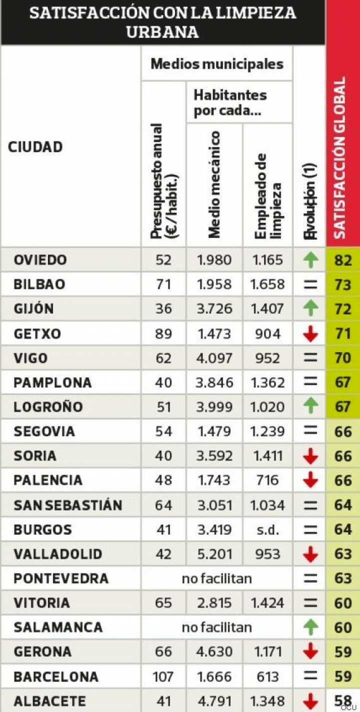 Una vez más Oviedo repite como la localidad donde los ciudadanos están más satisfechos con su limpieza. Le siguen Bilbao, Gijón, Getxo y Vigo, con una satisfacción por encima del notable. En el extremo opuesto se sitúan Jaén, Valencia, Alicante y especialmente Madrid y Alcalá de Henares como las ciudades peor valoradas por sus vecinos en lo que a limpieza se refiere.