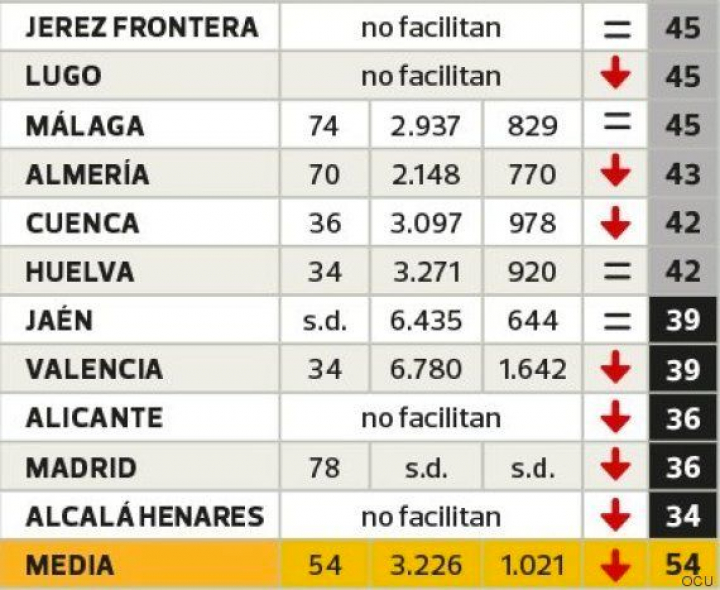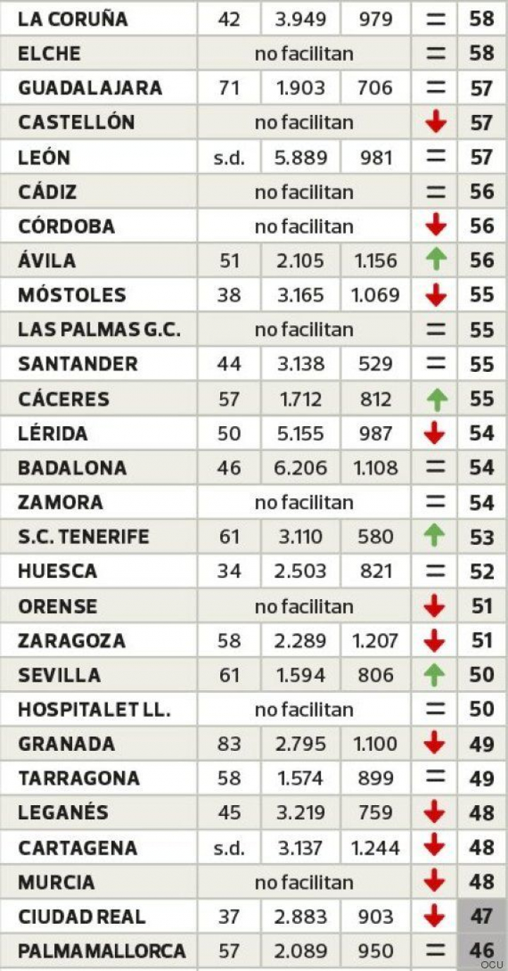 La OCU subraya que son las ciudades en las que el presupuesto municipal se ha reducido donde más ha caído la valoración, caso de Cuenca, Valencia y Zaragoza. Por el contrario, un incremento de los presupuestos ha aumentado la satisfacción de los usuarios como en Gijón, Sevilla y Santa Cruz de Tenerife.