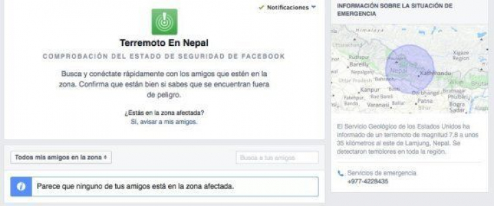 Facebook también ha puesto en marcha la aplicación Safety Check, una aplicación de búsqueda de personas afectadas por el terremoto. La red social detecta que una persona está ubicada en una zona de alerta y pide confirmar al usuario si se encuentra a salvo, una información que se trasmite a sus contactos. También conecta con los amigos que estén en la zona para que puedas aportar información sobre su situación.