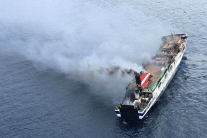 Técnicos acceden al ferry incendiado para evaluar daños y estudiar cómo remolcarlo