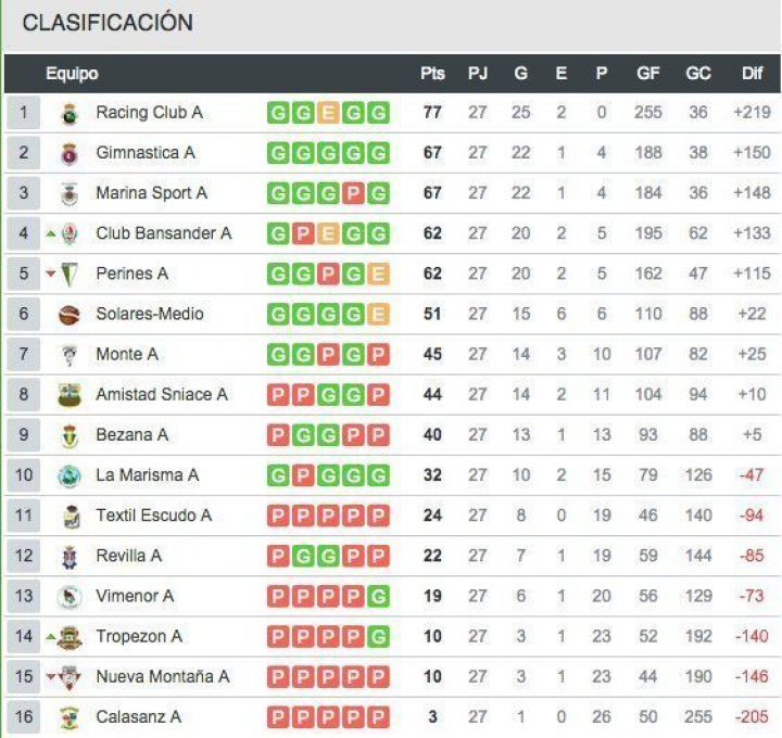 El Calasanz, último de la tabla, lleva una media de 9,4 goles en contra por encuentro, con 255 tantos en contra en 27 partidos disputados. El Racing tiene también 255 goles, pero a favor, y es líder de la categoría.