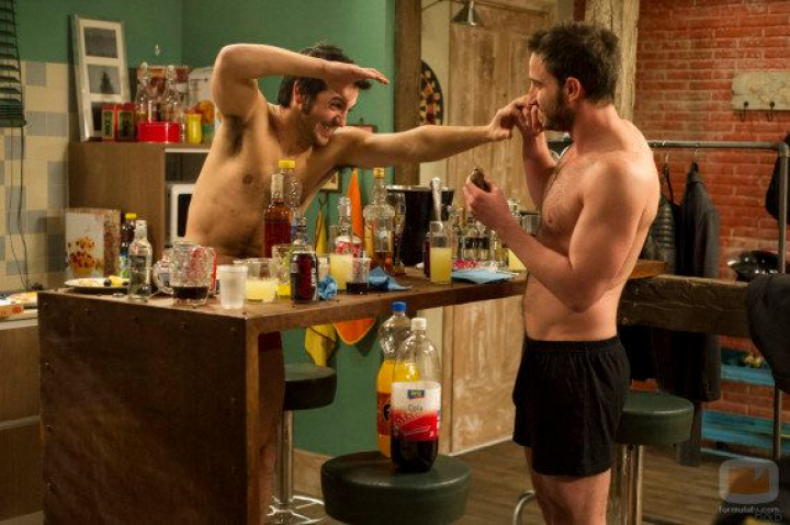 Y también lo normal es que el desayuno se haga con algo de ropa —incluso en verano— pero Dani Rovira y Fran Perea (Mario y Juan) aprovechan para enseñar los resultados de horas y horas de gimnasio.