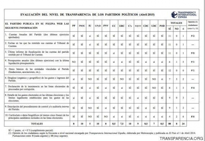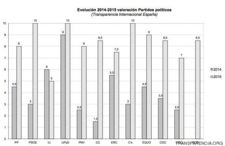 Del suspenso al notable alto o directamente al sobresaliente. Los partidos políticos que el año pasado suspendían en transparencia, este año alcanzan valoraciones muy notables en la evaluación que hace Transparencia Internacional España y que ha publicado hoy.
