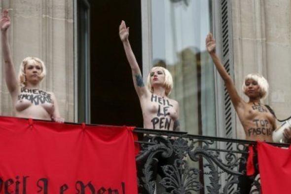 Primero, cuando Marine Le Pen se acercó a depositar un ramo ante la estatua de Juana de Arco y dos activistas irrumpieron la escena filmada por las cámaras de televisión a pecho descubierto y con el eslogan: "Le Pen TOP fascist". Ya en la tribuna, una vez que su padre había abandonado la concentración, su discurso resultó perturbado de nuevo por otras tres militantes de la misma organización feminista, que también en topless y ante la prensa hicieron el saludo nazi desde un balcón cercano.