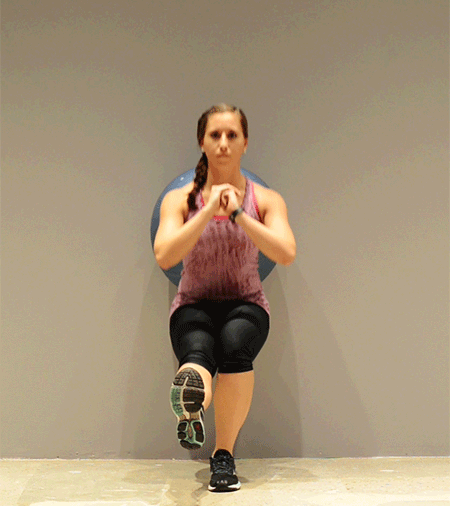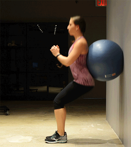 Paso 1: Busca un espacio en la pared vacío y coloca el balón de estabilidad entre la pared y el centro de tu espalda (justo debajo de los omóplatos y encima de las caderas). Ponte de pie en el suelo, con los pies a la altura de los hombros y colocados unos centímetros por delante del tronco, que apoyarás en el balón.