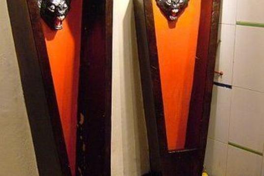 Estos tétricos urinarios están en el restaurante La Jugueteria en Bogotá, Colombia. Un detalle: el pedal donde se activa la cisterna parece un escarabajo gigante.