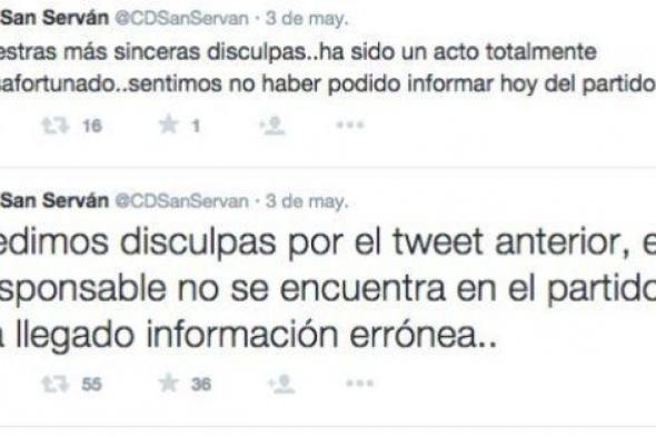 Era mentira. Todo era una broma de unos jóvenes a los que el jefe de redes sociales del club había pedido que le fueran informando del encuentro mientras él estaba en una comunión. Cuando hablaron por teléfono le vacilaron y este lo publicó. “Pinta mal la cosa, jugamos toda la segunda parte con uno menos, penalti y expulsión de Kouba, perdemos 2-0… decaen los ánimos…”. rezaba el tuit. El club no tardó en disculparse.
