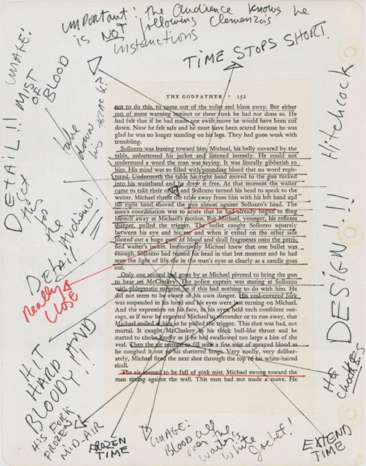 En 2011 se había movido en círculos de internet y tres años después, en 2014, renació cuando el usuario de Reddit Join_You_In_The_Sun, descubrió esta página de la famosa novela de Mario Puzo, El Padrino, con los garabatos de Francis Ford Coppola en los márgenes. Coppola dirigió la adaptación del libro en 1972, y transformó las páginas escritas por Puzo en una de las películas más aclamadas de todos los tiempos. A continuación, puedes ehar un vistazo a la hoja del libro del Puzo —corresponde a la escena en que Michael Corleone dispara a Sollozzo y McCluskey— y más abajo puedes ver el vídeo.