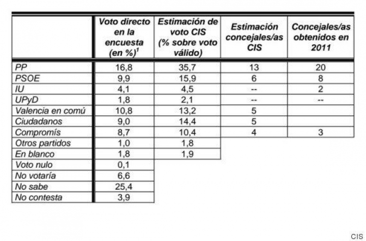 - PSOE+Valencia en Comú+Compromís=15 (no llegarían a la mayoría absoluta)