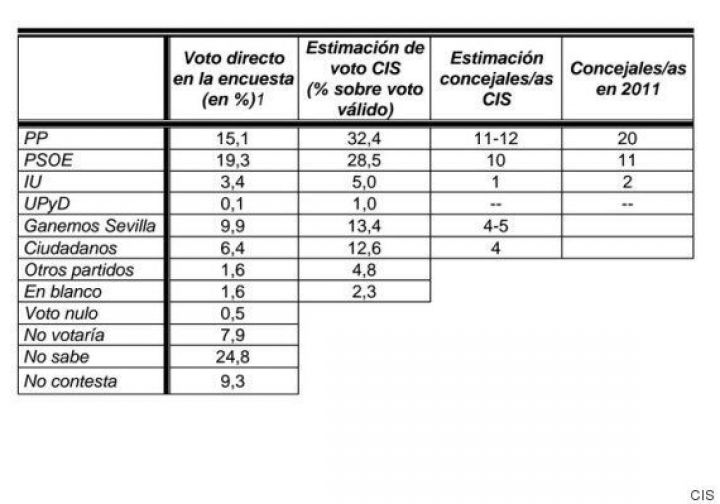 El PP sería el partido más votado en las elecciones municipales del 24 de mayo en ciudades como Madrid, Valencia, Sevilla, Santiago de Compostela, Zaragoza o Vitoria, pero necesitaría de pactos con otras fuerzas políticas para conseguir las alcaldías, según el Centro de Investigaciones Sociológicas (CIS).