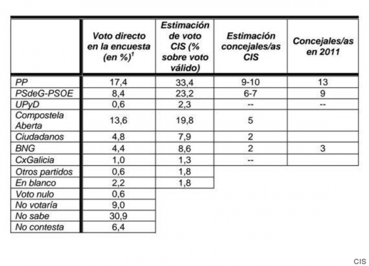 En Santiago, el PP volvería a ganar pese a que cae desde los 13 concejales hasta los 9 o 10 y se aleja de la mayoría absoluta. El PSOE también cae (de 9 a 6 o 7) y el BNG, que pierde uno y se queda en dos. Entra Compostela Abierta con 5 y Ciudadanos, con dos. Por tanto, los socialistas podrían liderar un tripartito en la capital de Galicia con Compostela Aberta y el BNG