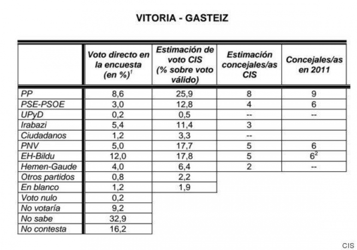 En Vitoria, el PP pierde únicamente un concejal (pasa de 9 a 8), mientras que el PSOE cae de seis a cuatro. El PNV pierde uno (de 6 a 5), lo mismo que Bildu. Irrumpen Irabazi (Ezker Anitza+Equo) con 3 y Hemen-Gaude (respaldado por Podemos) con 2.