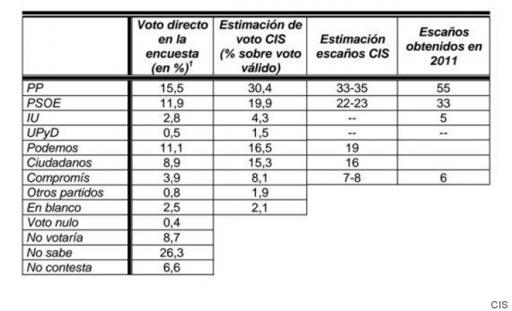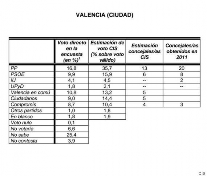 El segundo lugar lo ocuparía el PSOE con entre 22 y 23 escaños (en 2011 logró 33) y el tercer puesto sería para Podemos, que irrumpe con 19 escaños. Ciudadanos se quedaría con 16 y Compromís subiría desde los seis actuales hasta entre 7 y 8.