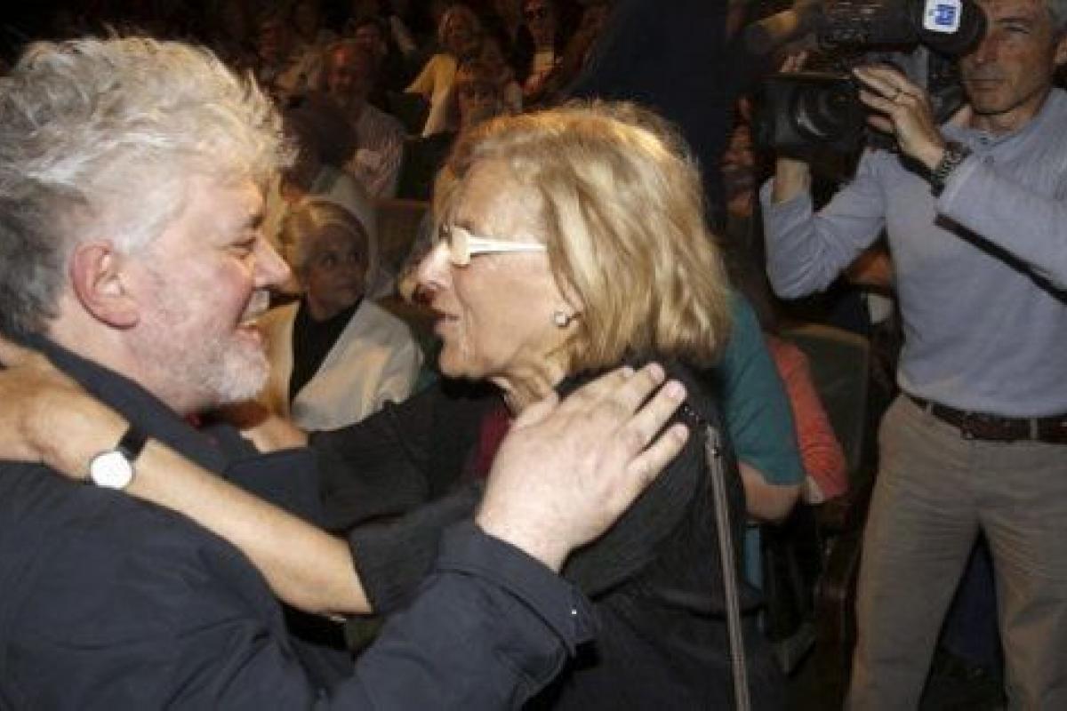 La candidata de Ahora Madrid al Ayuntamiento de la capital, Manuela Carmena, junto a Pedro Almodóvar y las actrices Inma Cuesta y Marisa Paredes, antes del comienzo de un acto celebrado hoy en el Círculo de Bellas Artes de Madrid.