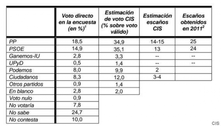 De acuerdo con el sondeo, el PP obtendría 14-15 escaños y la segunda fuerza sería el PSOE, que lograría 13 escaños, seguidos de Ciudadanos en su estreno en estas elecciones (3-4 escaños) y Podemos, con 2 escaños. IU -con el 3,3% de los votos- y UPyD -con el 1,4%- se quedarían sin representación en las Cortes castellano-manchegas.