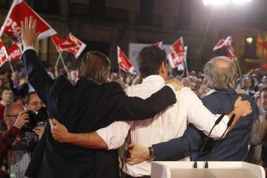 Manuela Carmena, candidata de Ahora Madrid a la Alcaldía de la capital, arropada por el director Pedro Almodóvar y las actrices Inma Cuesta y Marisa Paredes.