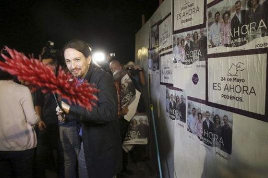 Pablo Iglesias, líder de Podemos, bromea con una escoba en la pegada de carteles junto al candidato autonómico José Manuel López.