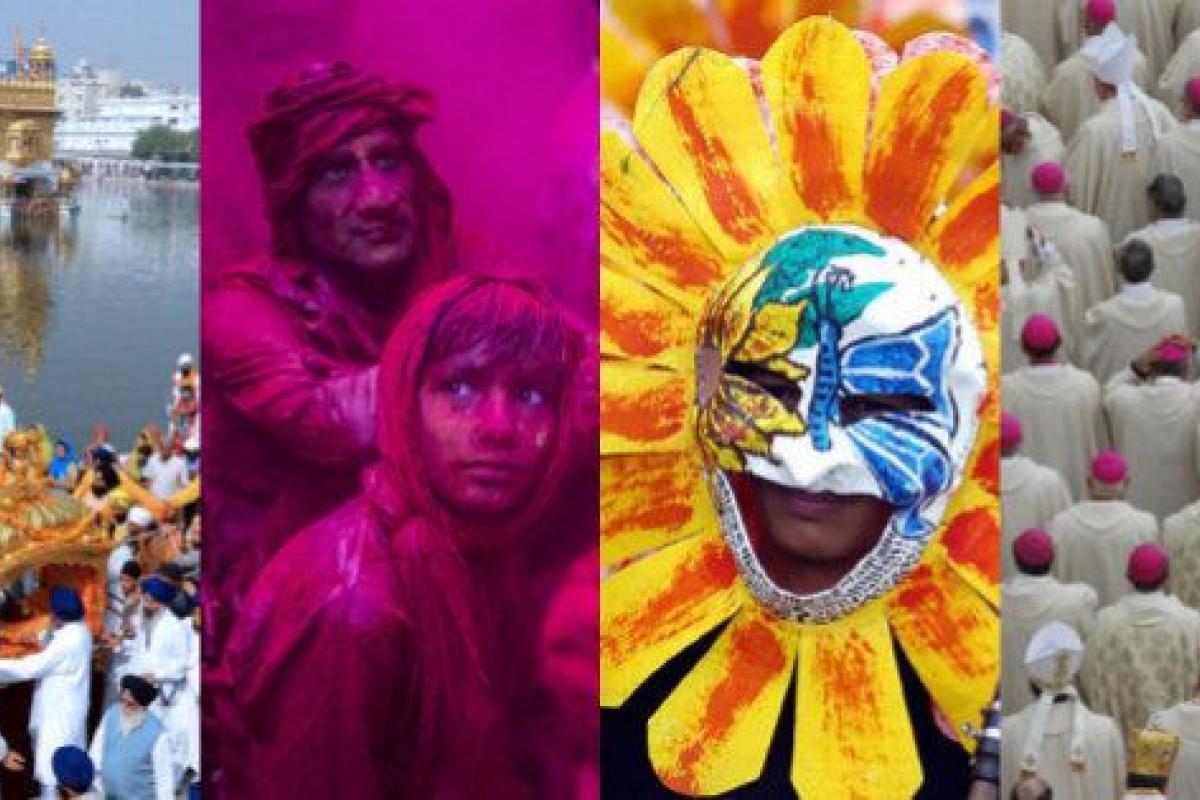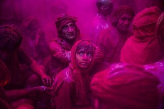 Un niño contempla el desarrollo de las celebraciones y juegos con el color de la fiesta Lathmaar Holi en Barsana (India) el 21 de marzo de 2013. La tradición viene de la leyenda de Radha y la divinidad hindú Krishna.