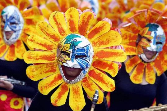 Universitarios filipinos vestidos con disfraces de flores de colores bailan frente a los expectadores durante la celebración del festival anual de las flores Panagbenga, en el resort montañoso en el norte de Baguio, el 26 de febrero de 2006. E...