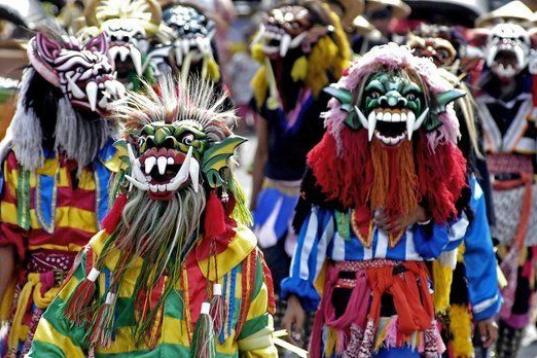 Habitantes de las laderas del Monte Merapi llevan coloridos disfraces y máscaras durante un desfile en Yogyakarta, centro de Java (Indonesia) el 18 de junio de 2006, en memoria de las víctimas del terremoto del 27 de mayo. Aunque el Merapi no ...