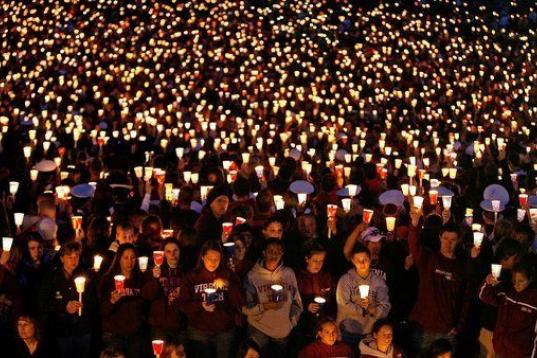 Miles de personas participan en una vigilia en el campus tecnológico de Virginia el 17 de abril de 2007. El estudiante de literatura Cho Seung-Hui, un surcoreano de 23 años, disparó a varios de sus compañeros y mató a 33 personas en la univ...