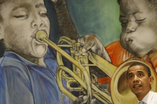 El candidato presidencial demócrata, el senador de Illinois Barack Obama, visita el restaurante Dooky Chase de Nueva Orleans el 7 de febrero de 2008. Obama visitó la ciudad antes de las primarias de Louisiana el día 9, y comparó la devastaci...