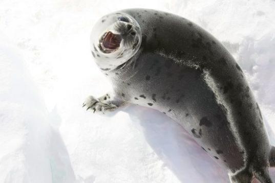 Una cría de foca de Groenlandia navega sobre un trozo de hielo el 31 de marzo de 2008 por el Golfo de San Lorenzo, cerca de Charlottetown, Canadá. Durante la temporada anual de caza del país el Gobierno permitió la caza de 275.000 focas. Muc...
