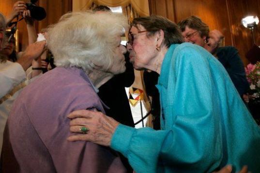 Una pareja de lesbianas, Del Martin (izquierda) y Phyllis Lyon (derecha), se besa tras ser proclamadas matrimonio por el alcalde de San Francisco, Gavin Newsom, en una ceremonia privada en el ayuntamiento de la ciudad el 16 de junio de 2008. Fue...