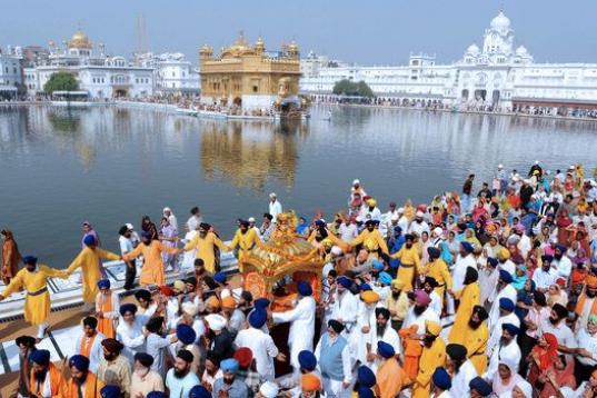Devotos sikh transportan su libro sagrado durante una procesión desde Sri Akal Takhat al Templo Dorado de Amritsar, en India, el 31 de octubre de 2009, en la víspera del aniversario por el nacimiento del gurú Nanak Dev.