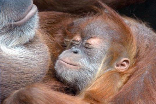 El bebé orangután Dodi descansa en brazos de su madre, Daisy, el 19 de julio de 2010 en el zoo de Dresde, al este de Alemania. Dodi nació el 24 de noviembre de 2009 en el zoo. La foto capta un momento de ternura entre madre e hijo.