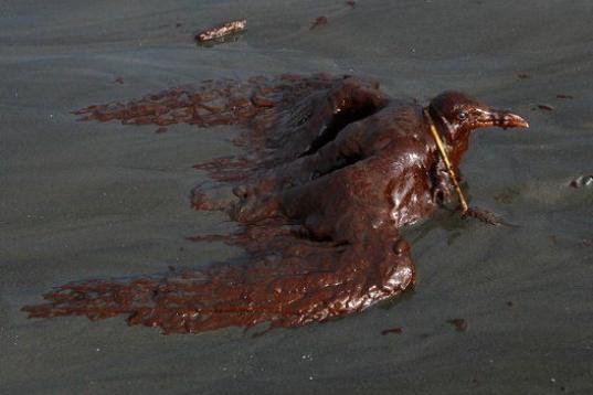 Una gaviota reidora empapada de petróleo trata de moverse en la orilla de la isla Grande-Terre de Louisiana el 4 de junio de 2010. El vertido por el incidente Deepwater Horizon alcanzó la costa del sudeste del estado.