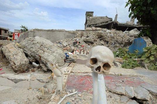 Una calavera humana clavada en un poste cerca de un edificio destruido por un terremoto el 25 de agosto 2010 en Puerto Príncipe, Haití.