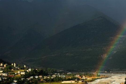 Un arcoiris brilla sobre las montañas de la región de Svanetia (Georgia) el 8 de septiembre de 2010. En lo alto del Cáucaso, un paisaje salvaje de picos cubiertos de glaciares, valles boscosos y pueblos formados alrededor de torres medievales...