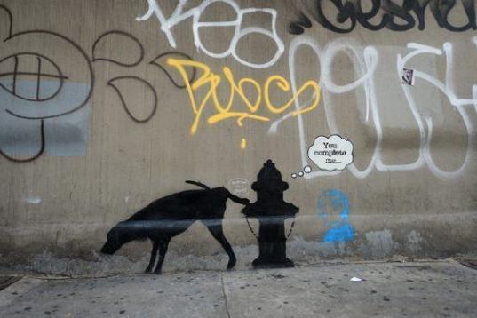 Una obra callejera del elusivo Banksy se exhibe en una pared en forma de graffiti, parte de su exhibición de un mes de duración en Nueva York el 3 de octubre de 2013, Better Out Than In.